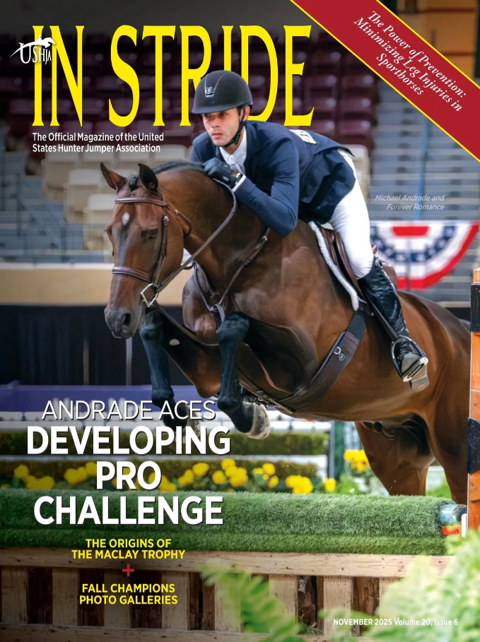 Published bimonthly, each issue of In Stride is THE magazine for the most recent and informative news for the hunter/jumper community. It is packed full of useful tips to promote equine health and well-being, training and competition articles, full-color photos from events and awards ceremonies, and much more. With an audience of more than 40,000 USHJA members, In Stride reaches a vast group of riders, trainers, owners, and more. The magazine is a benefit for members only, delivered right to their doorstep every other month. Find past issues of In Stride here or click here to access the searchable archive.