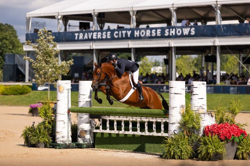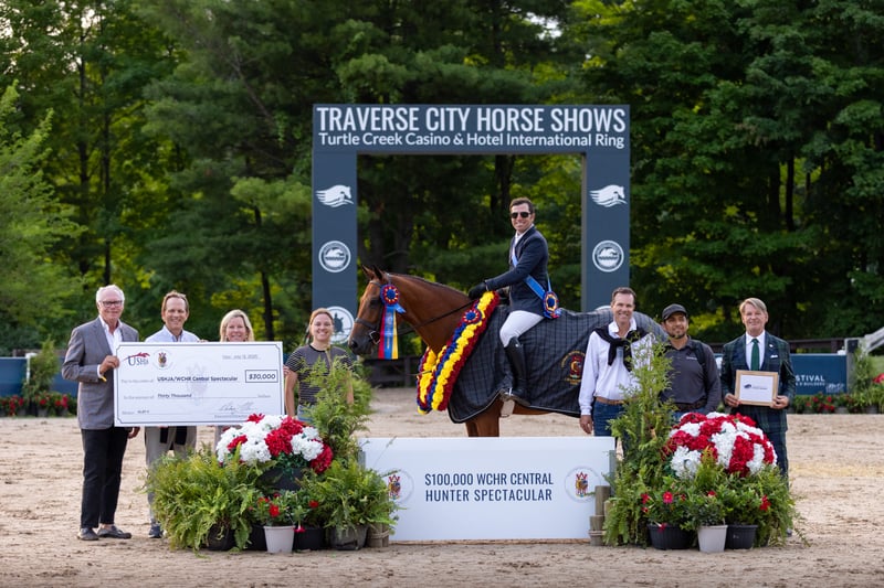 Traverse City, Mich.—July 12, 2025—There isn't a WCHR Hunter Spectacular that Nick Haness hasn't won, and his dominance continued on Saturday, July 12, in the $100,000 USHJA WCHR Central Hunter Spectacular. Aboard Odette, the San Clemente, California, rider soared to a record fourth victory at the Traverse City Horse Shows Great Lakes Equestrian Festival II, finishing ahead of himself on Clear As Day and Hunt Tosh with Cannon Creek.
