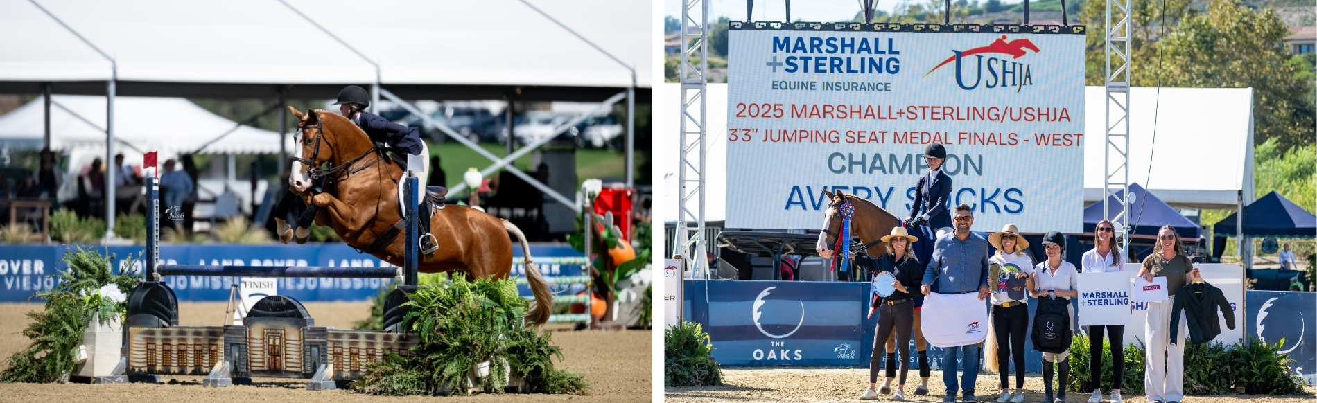 San Juan Capistrano, Calif.—Sept. 23, 2025—Junior riders from across the West Coast gathered on September 19-20 for the Marshall+Sterling/USHJA 3'3" Jumping Seat Medal Final - West, held at The Oaks Finale 2 in San Juan Capistrano, California. Rising to the occasion, Avery Socks of Encinitas, California, rode her own FF ButterCup to the win with a three-phase total of 347. Addison Henssler and Cover Girl claimed the reserve title, while Samantha Wood and Diador Von Der Heidi rounded out the podium.