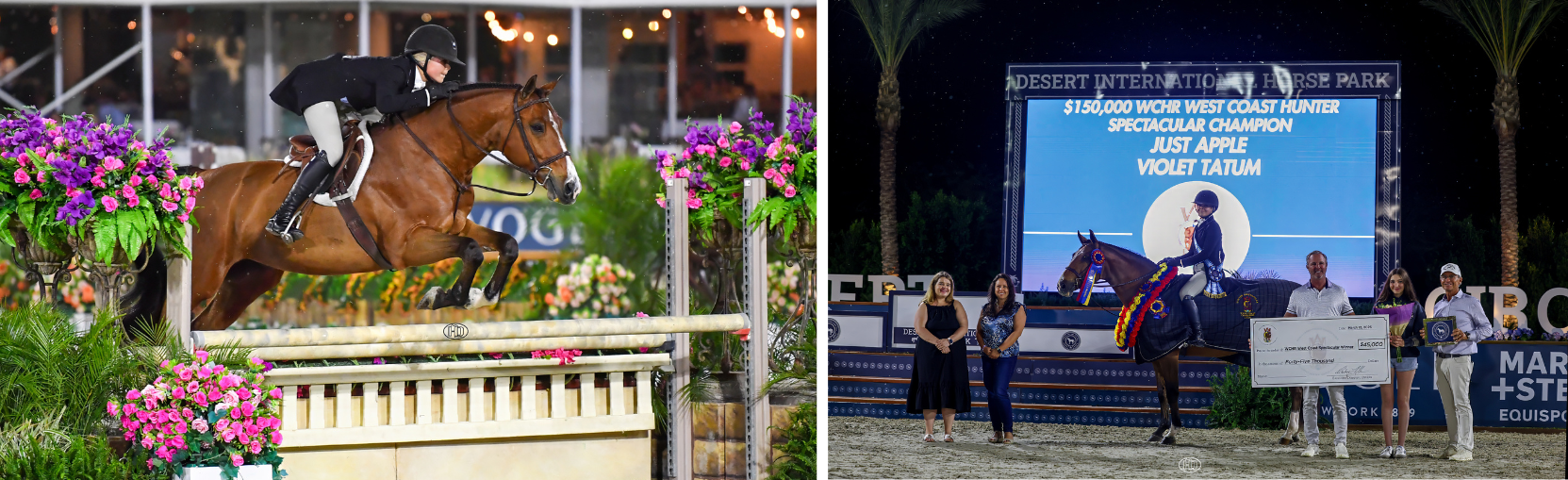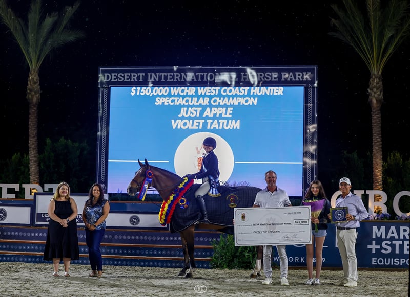 Thermal, Calif.—Mar. 14, 2026—Violet Tatum, 17, made history on Friday, March 13, by becoming the first Junior rider to win the $150,000 USHJA World Championship Hunter Rider West Coast Hunter Spectacular. Tatum and Just Apple, owned by Becky Equestrian LLC, led the class from beginning to end to take home the victory during Desert Circuit 10.