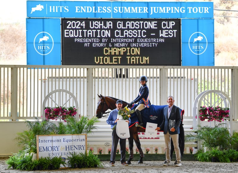 Del Mar, Calif.—July 24, 2024—After three rounds of competition at HITS Del Mar Horsepark, Violet Tatum claimed the 2024 USHJA Gladstone Cup Equitation Classic - West, presented by Intermont Equestrian at Emory & Henry University, aboard Iron Man van de Kalevallei. The California-based rider topped the class alongside barnmate Gable Gering in reserve and Camilla Jerng in third.